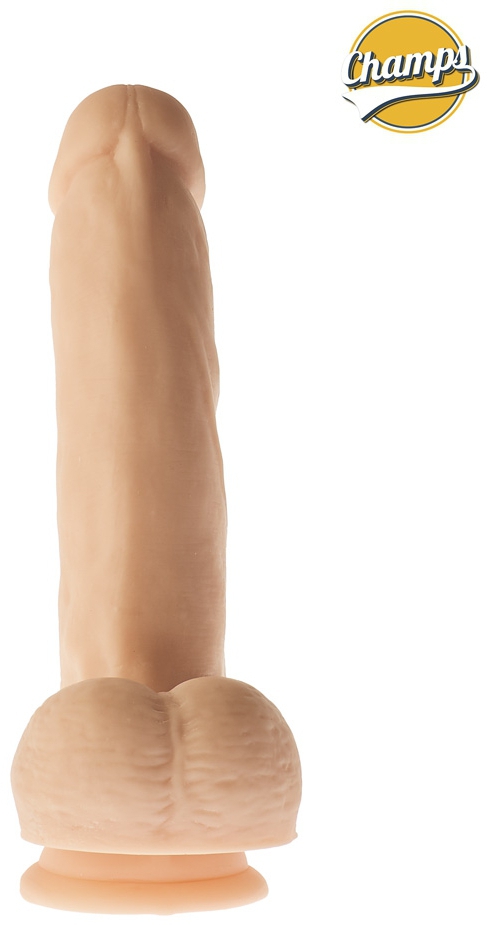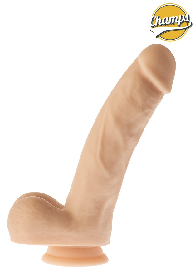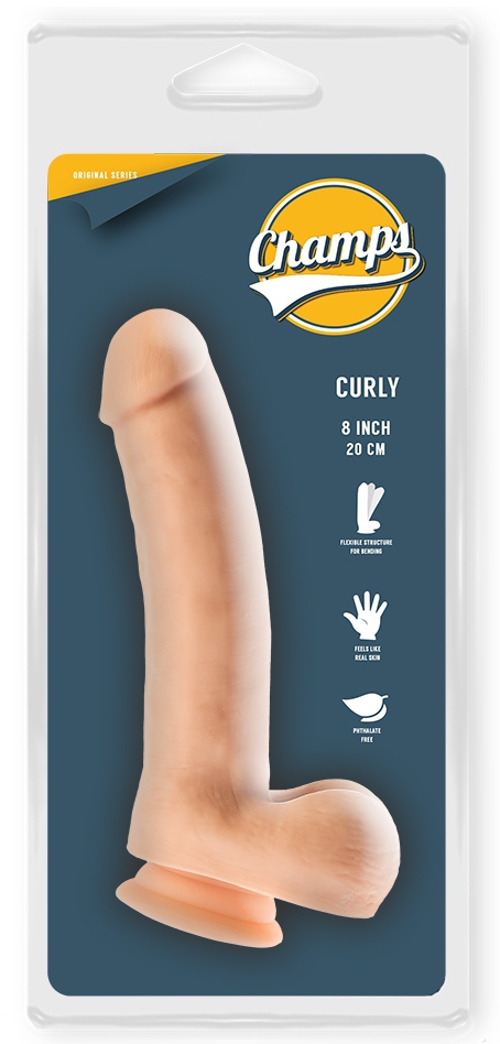 Le gode réaliste Curly Champs est un sextoy conçu avec une forme courbée et une structure souple. La longueur insérable est de 16cm. La largeur est de 4cm.Avec un gland sans prépuce et des bourses pour plus de réalisme. Avec une ventouse. Fabriqué en PVC souple