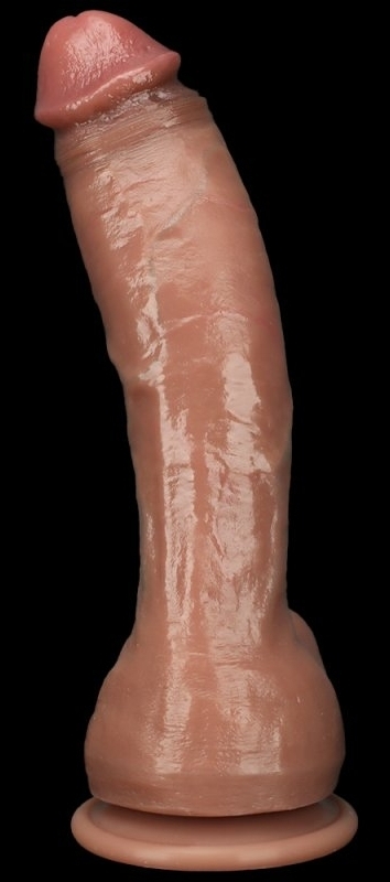 Gode réaliste avec un gland décalotté et une surface veinée Avec de larges bourses et une base ventouse Longueur insérable de 17 cm. Largeur maximale de 4.5 cm. En silicone