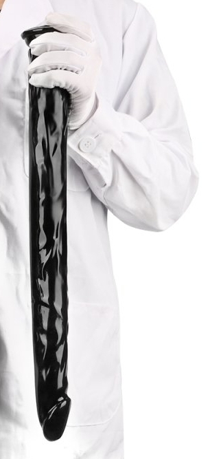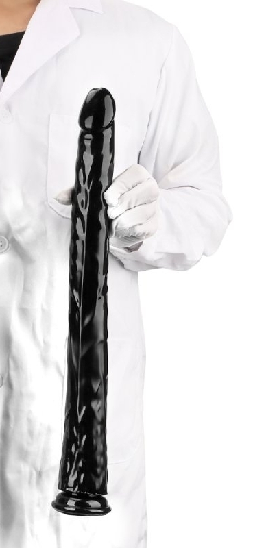 Gode noir avec une longueur insérable de 43 cm. Largeur de 3.5 à 5.5 cm.Structure souple.Base ventouse. En PVC