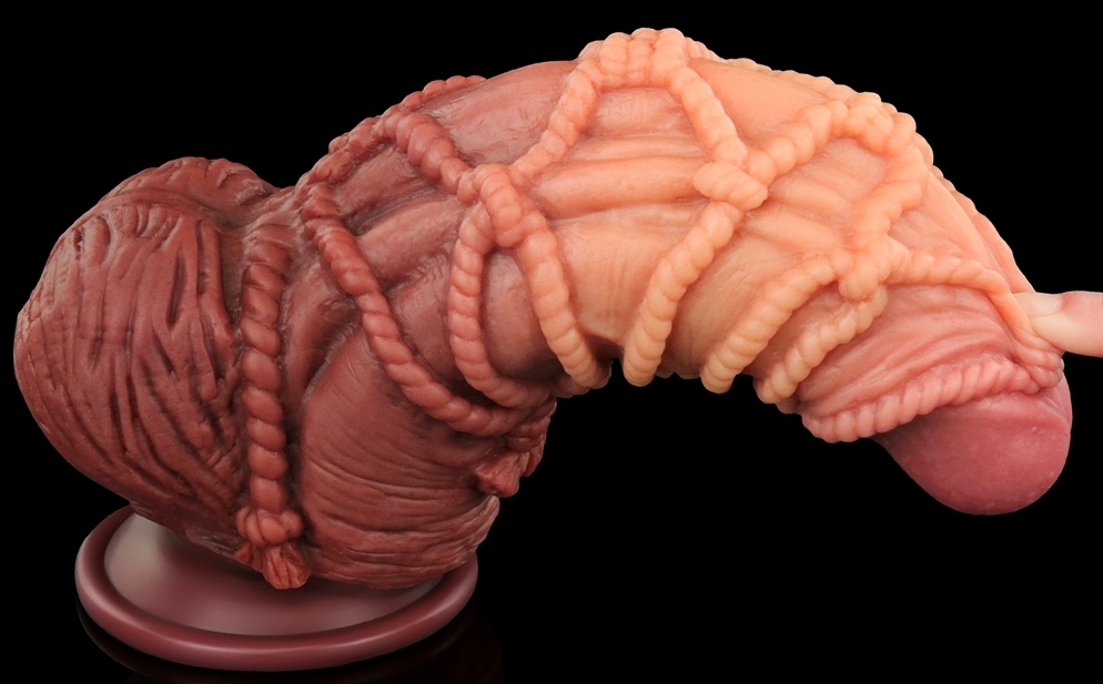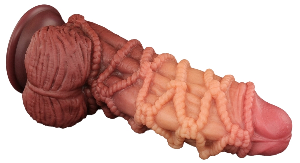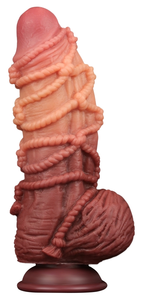 Gode avec une forme à la fois réaliste et bizarre.La surface est comme entourée d’une corde pour lui donner un relief important. Longueur insérable de 17 cm. Largeur de 4.5 à 7 cm. Avec les bourses et une base ventouse. En silicone