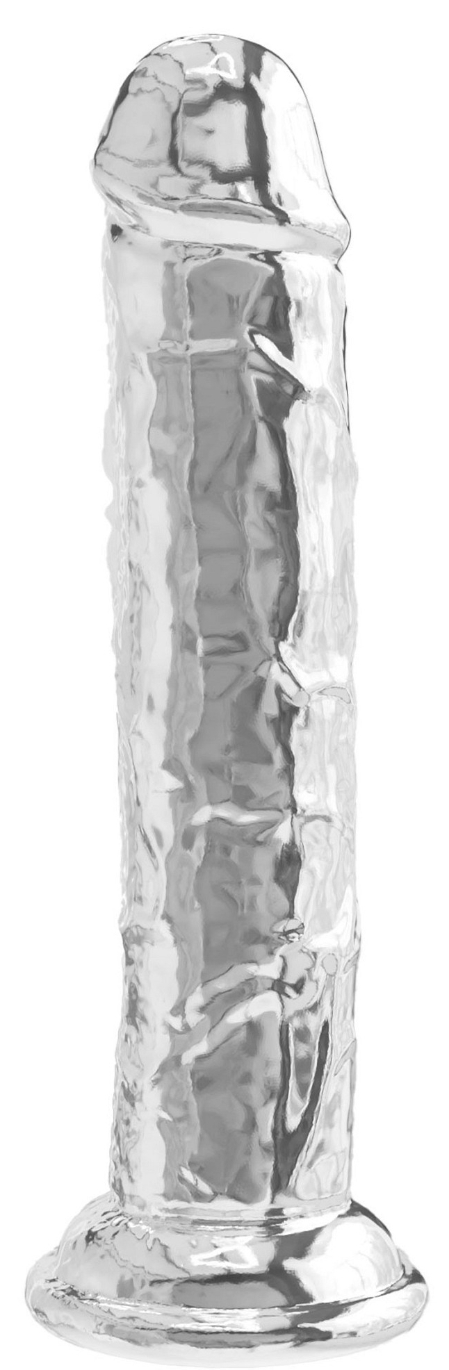Gode transparent Gland décalotté et veines apparentes Base ventouse Longueur insérable de 18 cm. Largeur maximale de 4 cm. En TPE