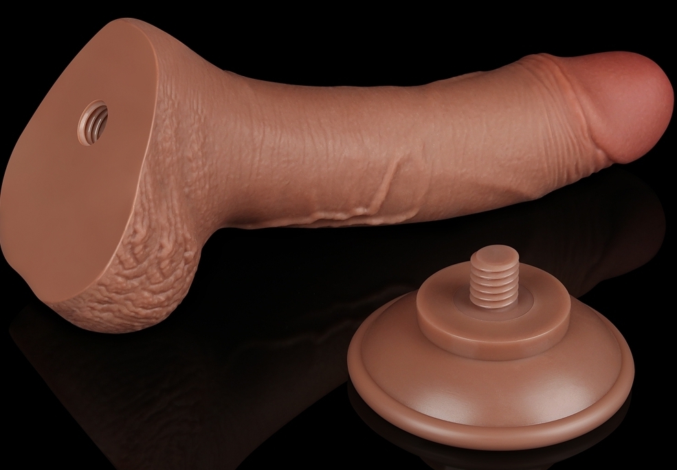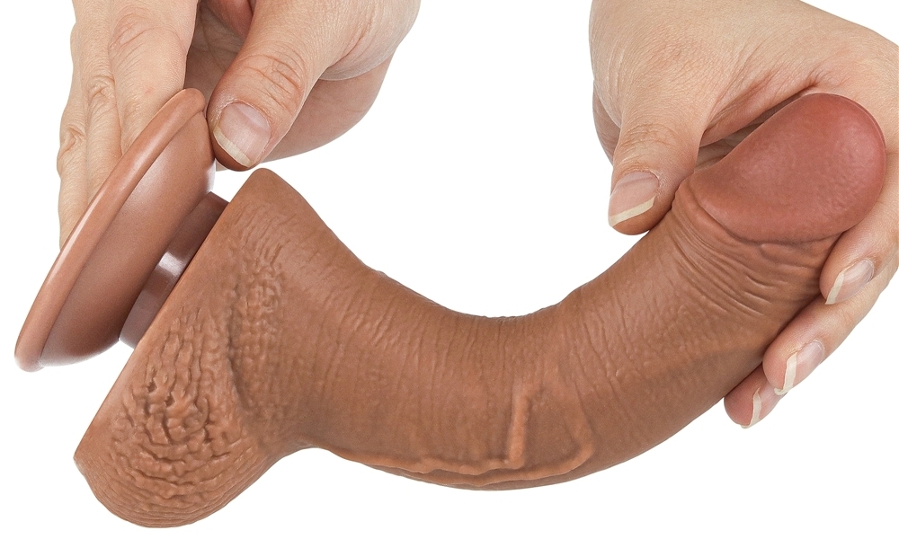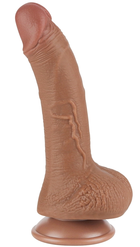Gode marron avec une forme réaliste. Sa longueur insérable est de 14 cm et sa largeur est de 3.5 cm.La surface est légèrement veinée et elle se plisse pour imiter la peau du pénis.Couleur imitant les peaux bronzées (latino, mecs méditerranéens). Avec base ventouse. En TPE