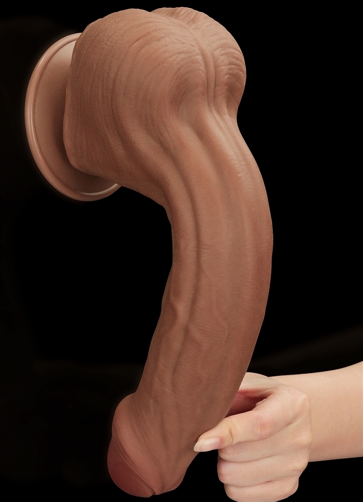Gode avec gland à moitié décalotté et surface veinée. Matière souple qui se plisse.Base ventouse amovible. Dimensions : Longueur de 20 cm. Largeur de 5.3 cm. En TPE.