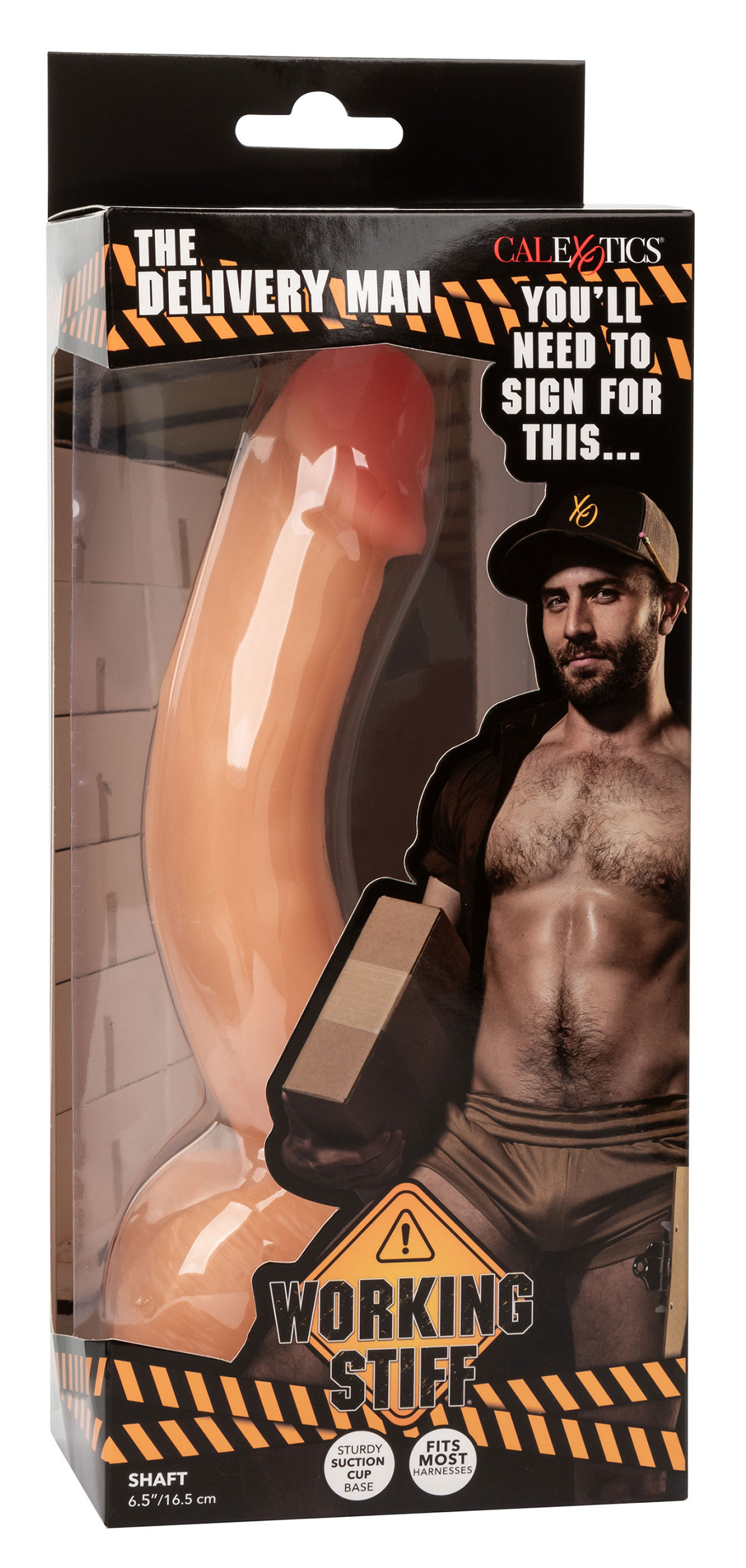 Gode à la forme courbée et à la surface texturée. Longueur insérable de 17 cm et largeur de 4 à 4.4 cm. Base ventouse et bourses rondes. En TPE