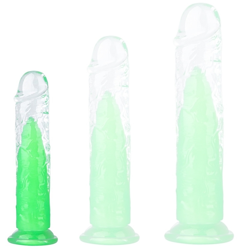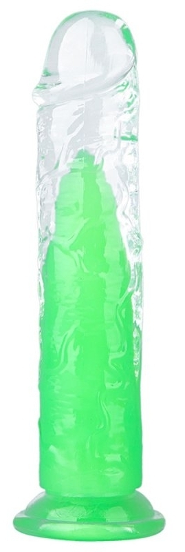 Gode transparent avec une barre verte à l’intérieur. Forme réaliste. Avec base ventouse. Dimensions : Longueur de 16.5 cm. Largeur maximale 3.3 cm. En TPE.