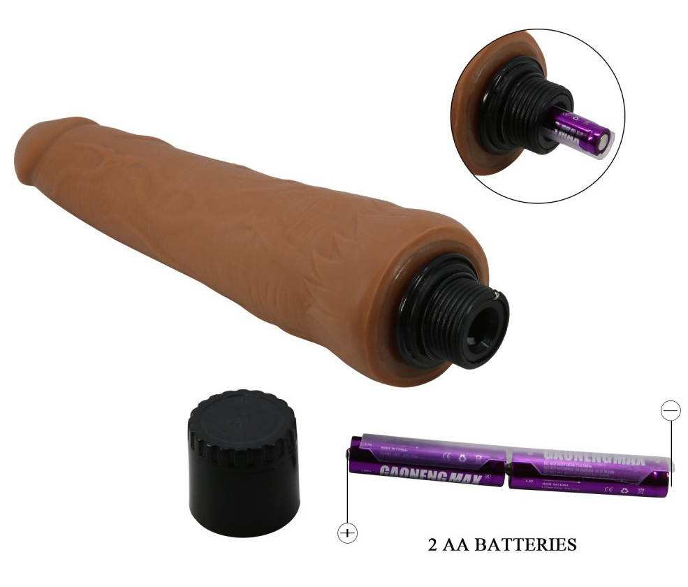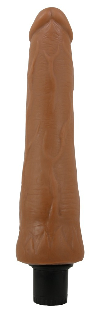 Gode de forme droite avec poignée variateur de vibrations. Longueur insérable de 21 cm et largeur de 3 à 5.5 cm. En TPR marron.