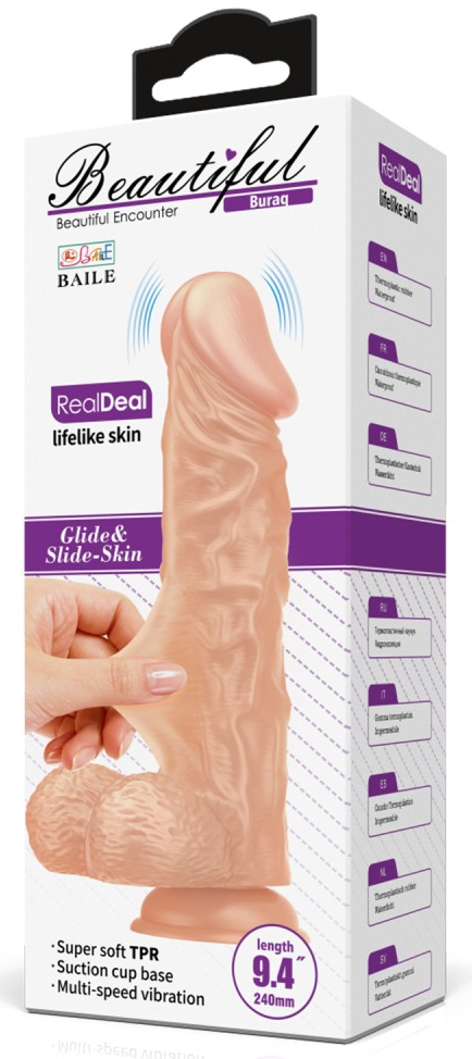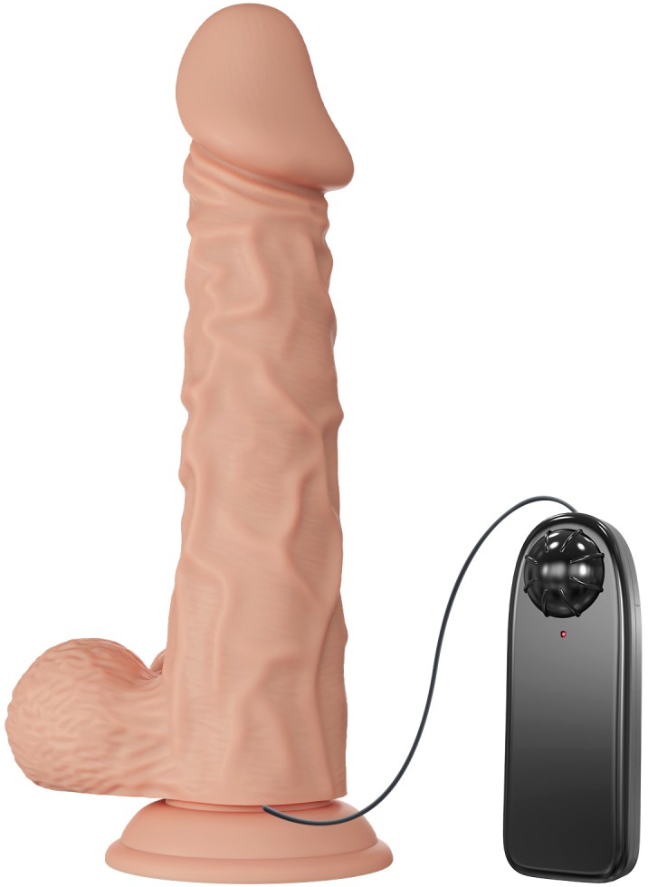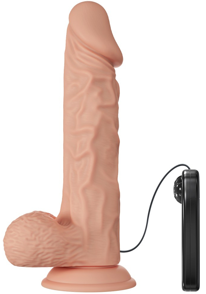 Gode Vibrant avec variateur d’intensité Gland décalotté, bourses rondes et base ventouse. Longueur insérable de 18 cm et largeur max de 4.5 cm Gode en TPR