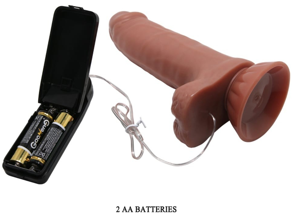 Gode avec un gland décalotté, corps plissé et bourses plates. Longueur insérable de 14 cm pour une largeur de 4 cm.  Base ventouse et télécommande à pile (2 AA non incluses) Gode marron en TPR