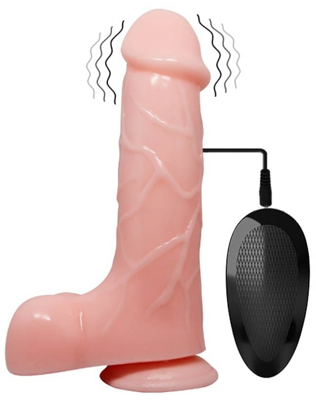Gode vibrant avec une télécommande de contrôle. Longueur insérable de 15 cm pour une largeur de 4.5 cm. Base de ventouse, bourses rondes, gland décalotté et corps texturé. En PVC