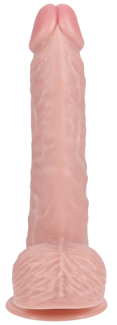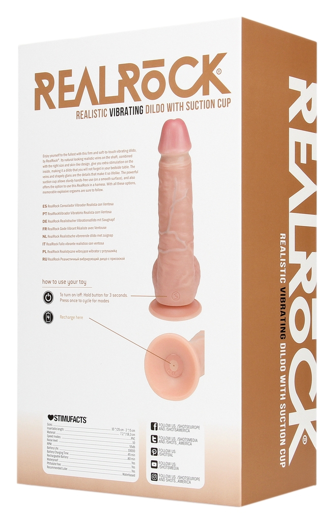 Gode avec une longueur insérable de 19 cm et une largeur de 5 cm.Avec une forme réaliste, un gland décalotté et une surface veinée.Avec la forme des bourses et une base ventouse. Avec 10 modes de vibrations. En PVC.Recharge USB.