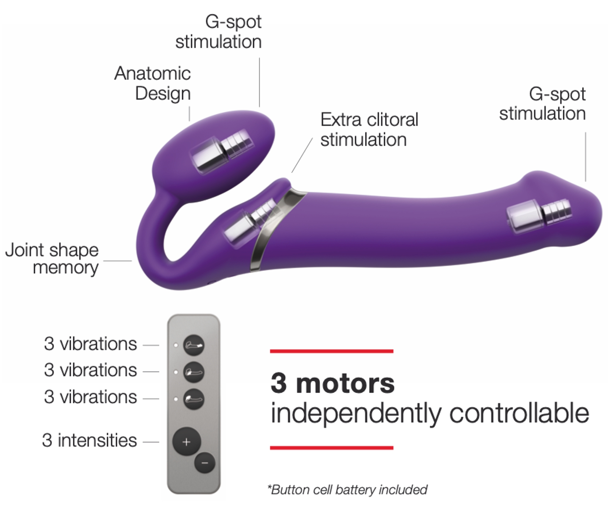 Ce gode vibrant est proposé dans la gamme des sextoys STRAP-ON-ME. Il est idéal pour obtenir des sensations très intenses et jouer à deux.Il se compose de : un gode de 16cm de longueur insérable et de 4cm de largeur (4.5cm sur le gland) le plug de 6.5 x 3.5cm. Les 3 moteurs sont indépendants.Avec une structure flexible