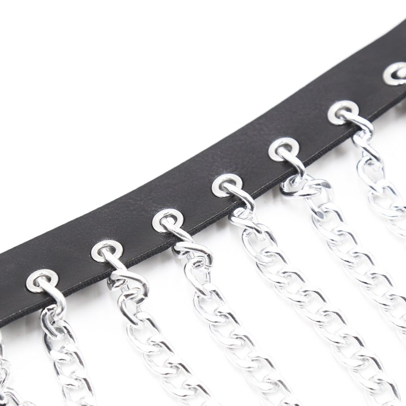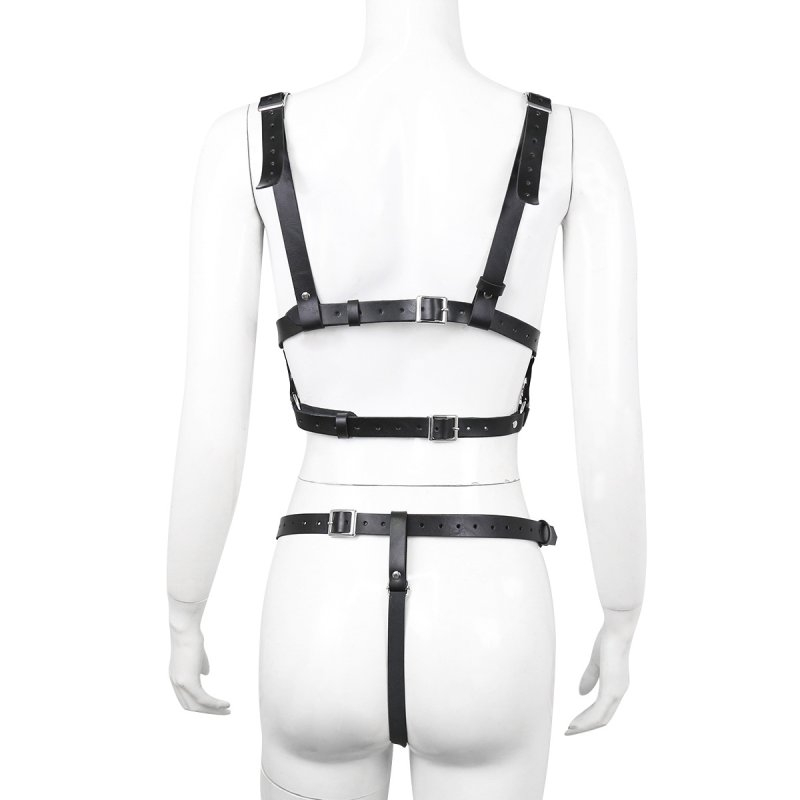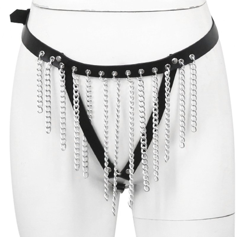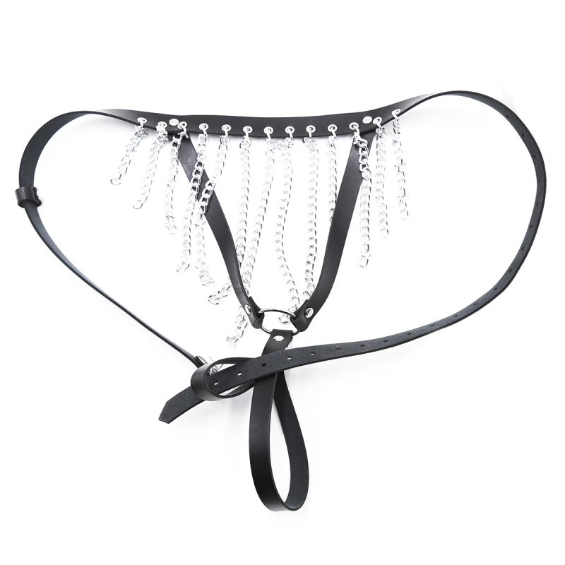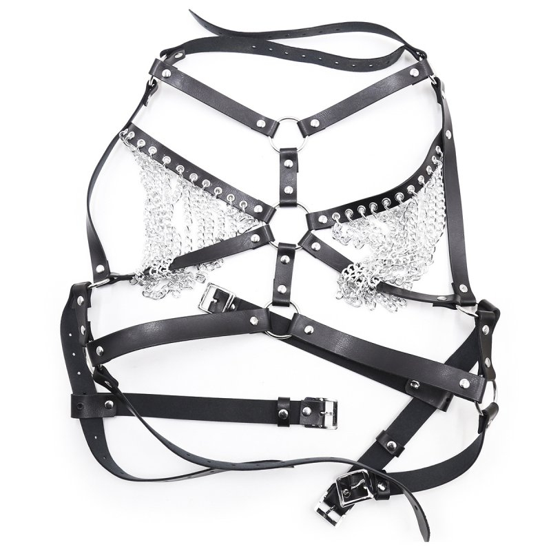 Harnais entier ouvert, avec chaînes métalliques argentées.Longueur ajustable du haut de 67 à 92 cm et longueur ajustable du bas de 67 à 113 cm.En simili noir.