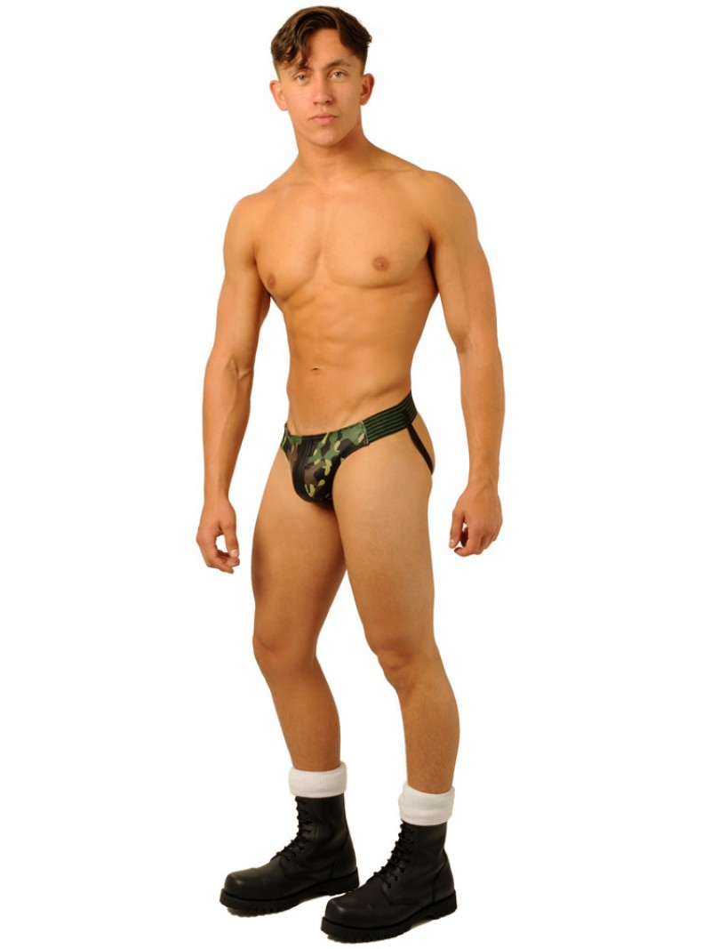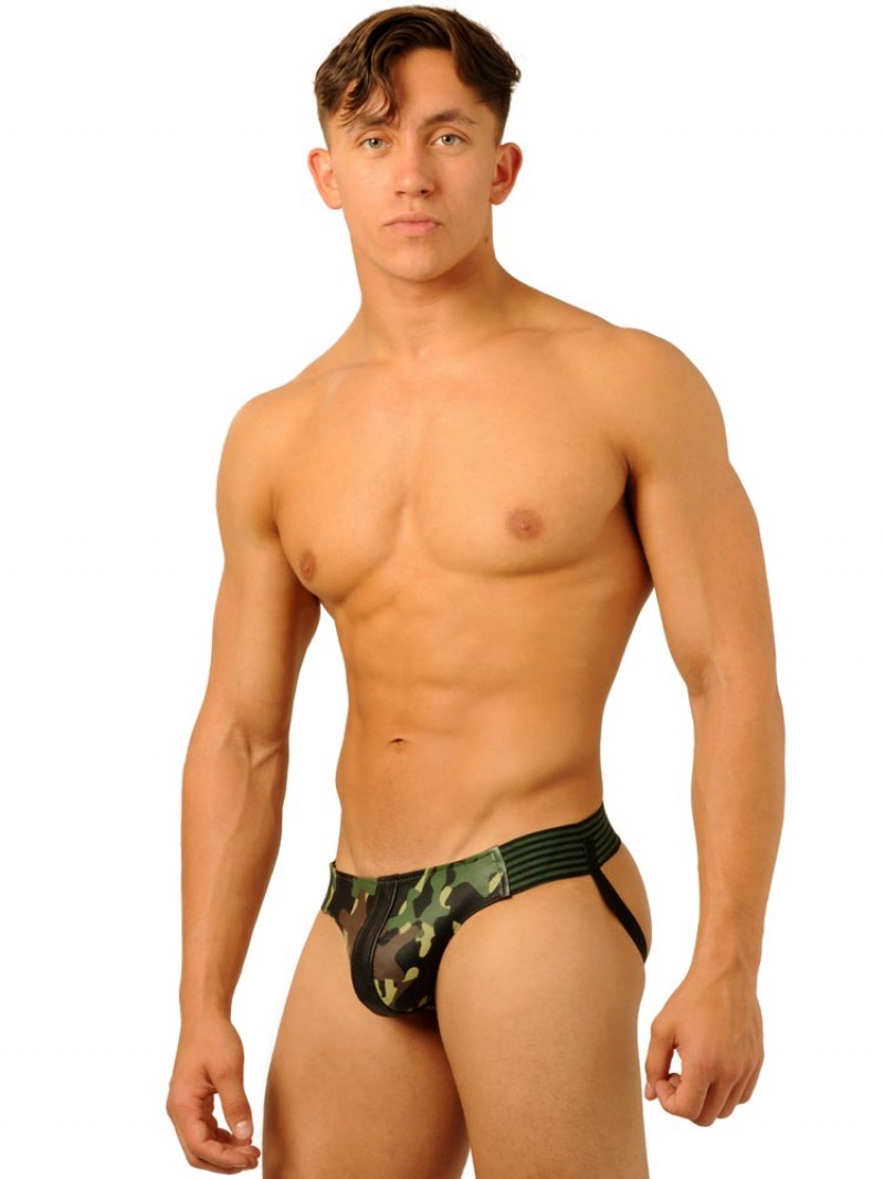 Ce jockstrap est conçu avec un motif Camouflage Army qui lui donne un style sexyIl possède une ceinture large de 5cm et des élastiques latéraux qui remontent les fesses. La partie avant est fabriqué en cuir très fin et confortable