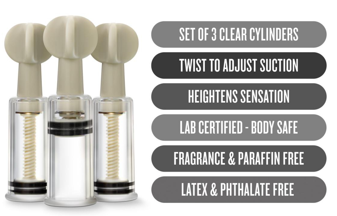 Faites gonfler vos tétons manuellement avec ce kit de 3 suce-tétons. Posez chaque cylindre à l’endroit souhaité et tournez l’hélice pour exercer une aspiration. Plus vous tournez, plus l’aspiration et votre sensibilité seront intenses. Pour encore plus de plaisir ! Dimensions : Longueur totale 10.3cm Longueur sans embout : 6cm Diamètre : 19mm