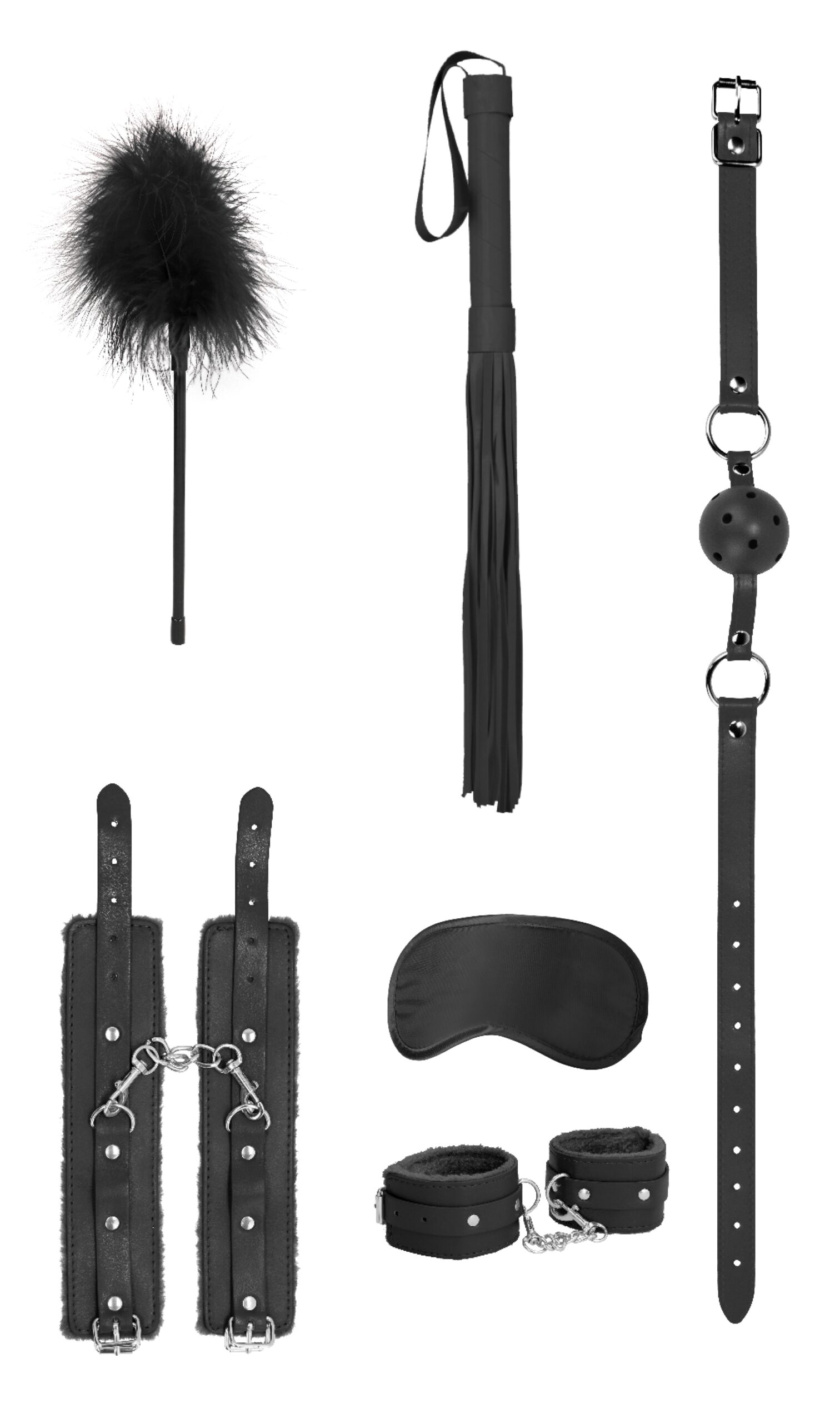 Ce kit pour débutant est composé de 6 accessoires de bondage : un masque en satin des menottes en simili avec un intérieur fourrure (poignets et chevilles) un baillon avec boule percée un martinet en simili un accessoire pour les chatouilles