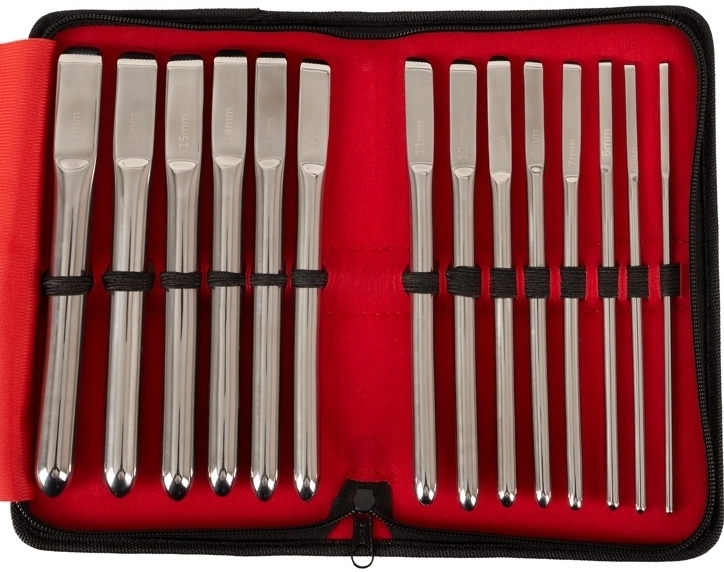 Améliorez votre pratique de la dilatation urétrale, à votre rythme, grâce au kit de 14 Tiges d’urètre DILATOR PROGRESS.Il est conçu avec des tiges dont les diamètres vont de 4 à 17 mm.La longueur insérable est de 13.5 cm. En acier inox