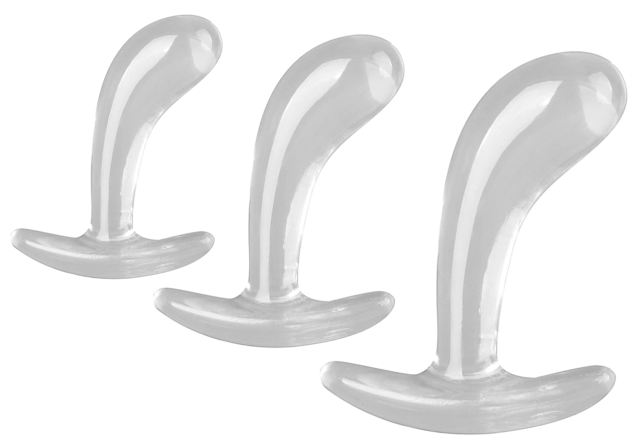 Kit de 3 plugs souples et transparents, avec forme incurvée. Plug S : longueur insérable 7 cm et largeur 2.2 cm Plug M : longueur insérable 8 cm et largeur 2.7 cm Plug L : longueur insérable 11 cm et largeur 3.5 cm En TPE.