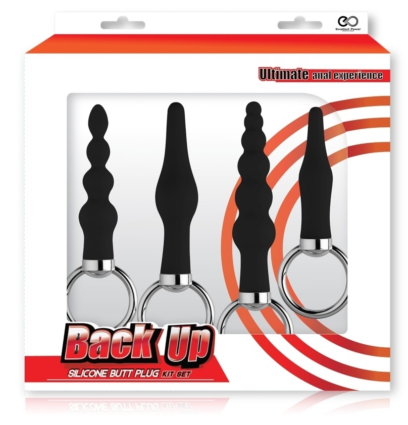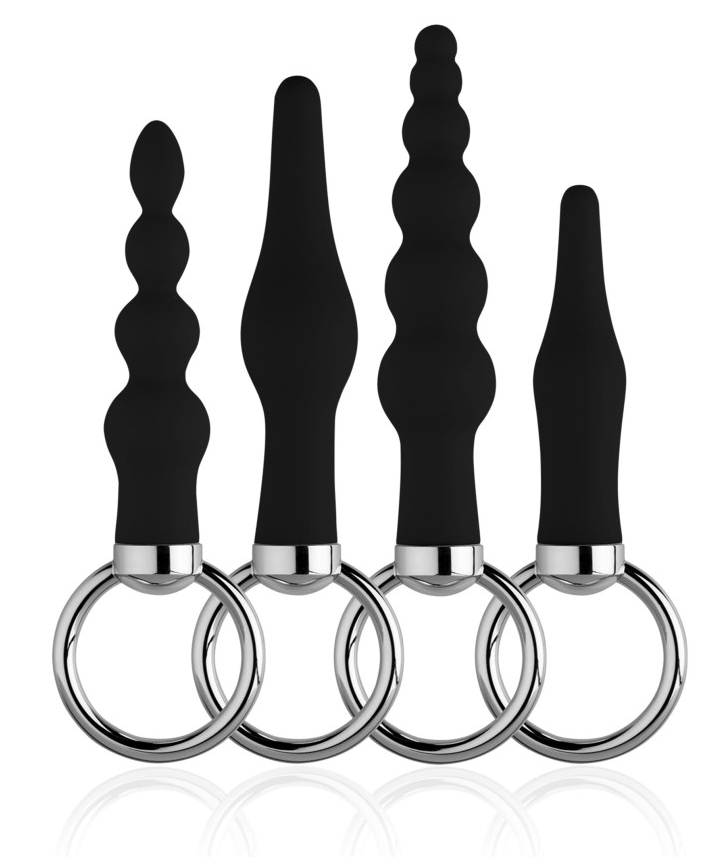 Kit de 4 plugs en silicone avec des dimensions réduites et des formes variées. Avec anneau en métal pour la prise en main. Dimensions : 7.5 x 1.7 cm, 8.5 x 2 cm, 9.5 x 2.2 cm, 10.5 x 2.3 cm.