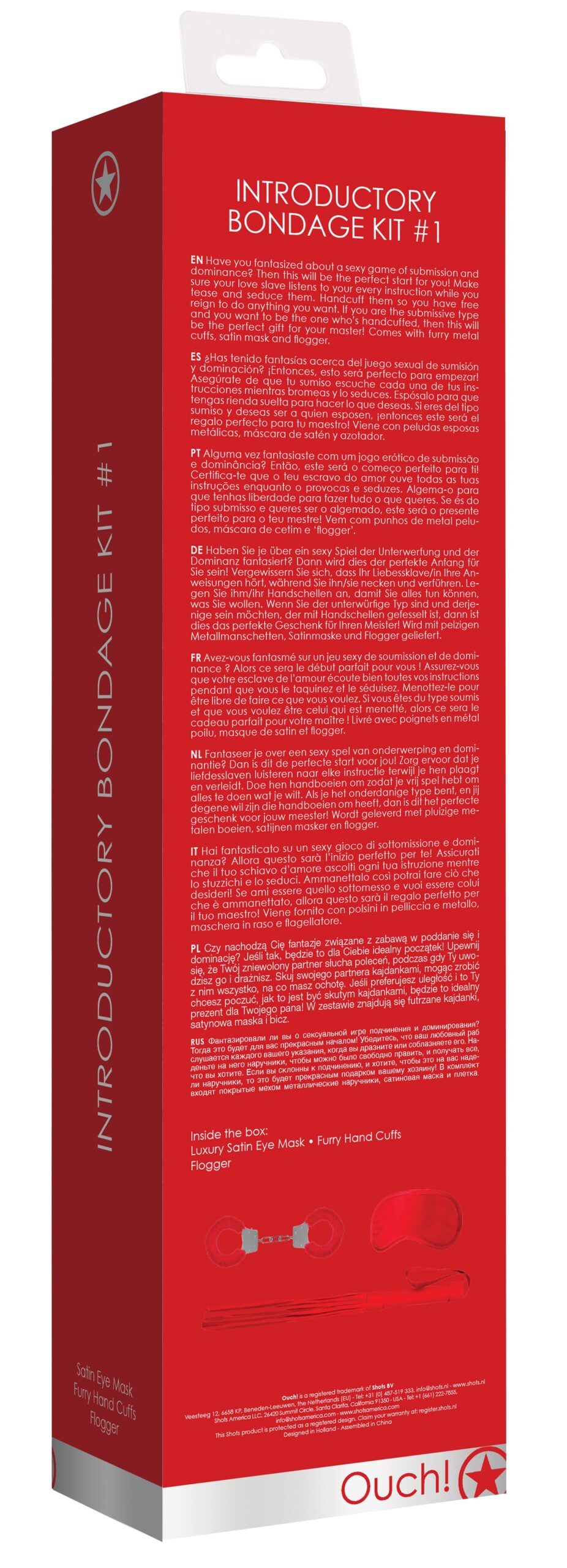Ce kit d’accessoires est idéal pour découvrir les plaisirs du bondage et de la soumission. Il se compose de plusieurs sextoys produisant des sensations excitantes.Le kit est composé de : un martinet rouge en simili avec des lanières de 33cm de longueur un masque en satin des menottes en métal avec une fausse fourrure pour un style plus élégant