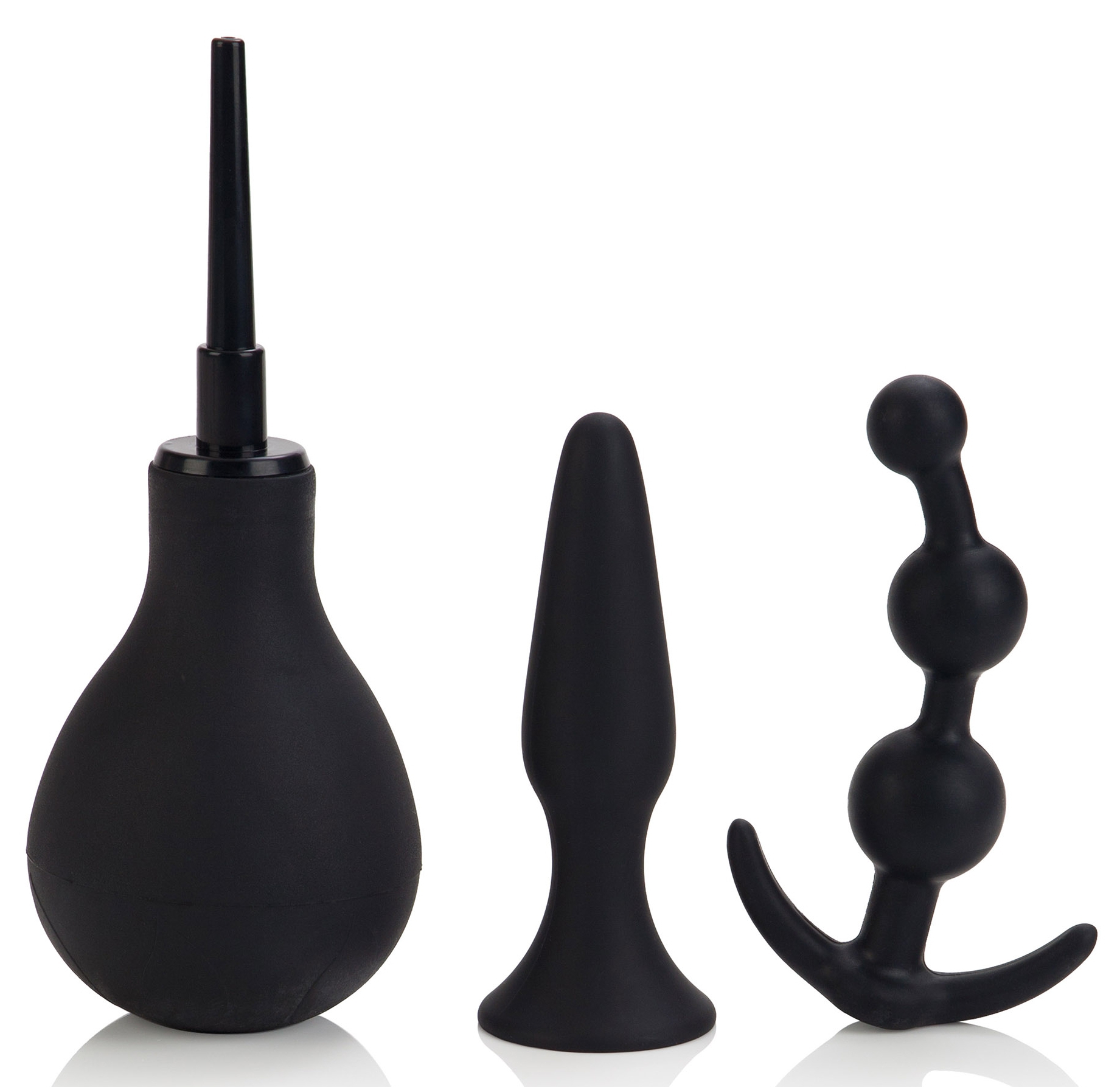 Ce kit de découverte du plaisir anal est composé de : un plug simple de 10cm de longueur insérable et de 3cm de largeur avec ventouse un autre plug avec des boules progressives (maximum 3cm) et une longueur insérable de 13cm la poire de lavement avec embout de 8cm. En silicone