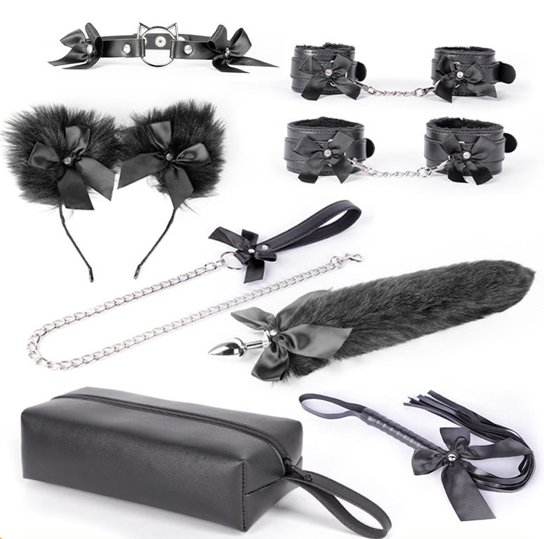 Ce kit Bow suit est composé de : un plug de 6 x 2.7cm avec une queue fourrure un serre-tête avec oreilles et petits noeuds un collier la laisse en métal les menottes de poignets les menottes pour les chevilles un martinet. Chaque accessoire comporte des noeuds. Avec la sacoche de rangement