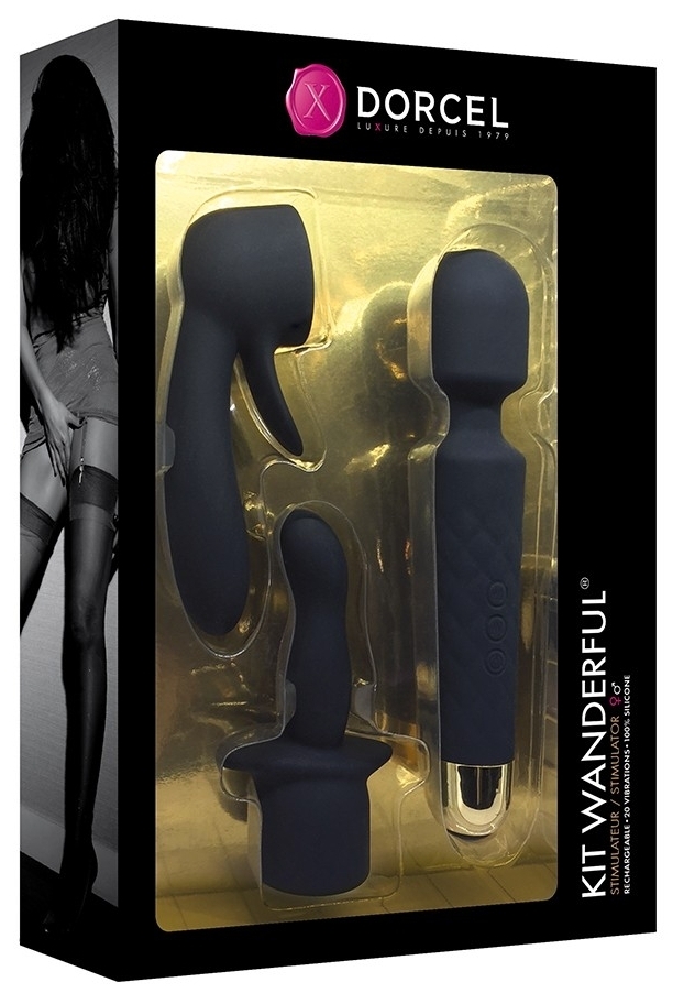 Le kit Wanderful® de la marque Dorcel est composé du wand et de 2 accessoires.Le wand mesure 20 cm de longueur totale et possède 20 modes de vibrations et 8 intensités. Avec un embout de 7.5 x 2.5 cm et un autre de 9 x 3 cm. Fabriqué en silicone.Recharge USB