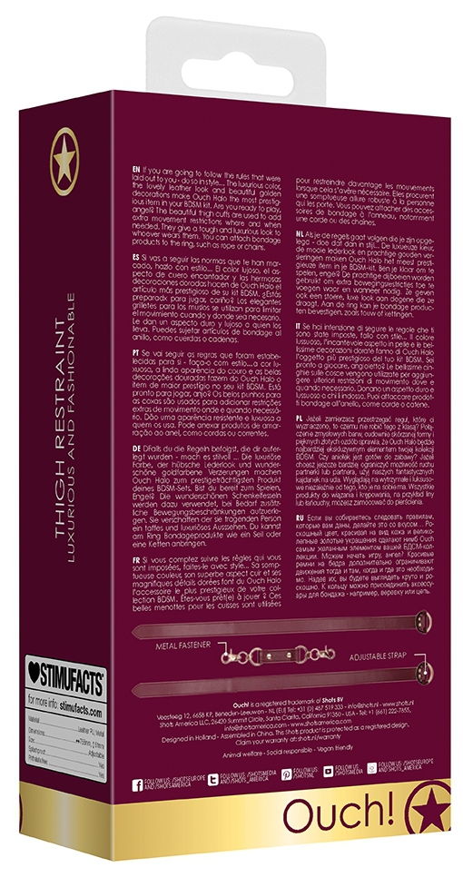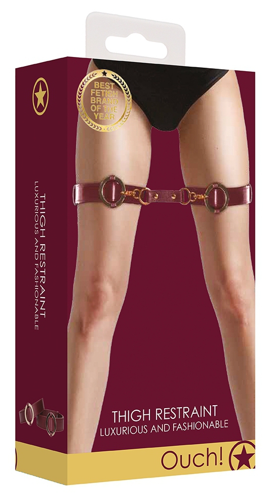 Ces liens permettent d’attacher les cuisses entre elles et de restreindre les mouvements.Avec des sangles qui s’ajustent aux cuisses.Largeur de 2.7cm. Avec des anneaux en métal doré. Fabriqué en polyuréthane