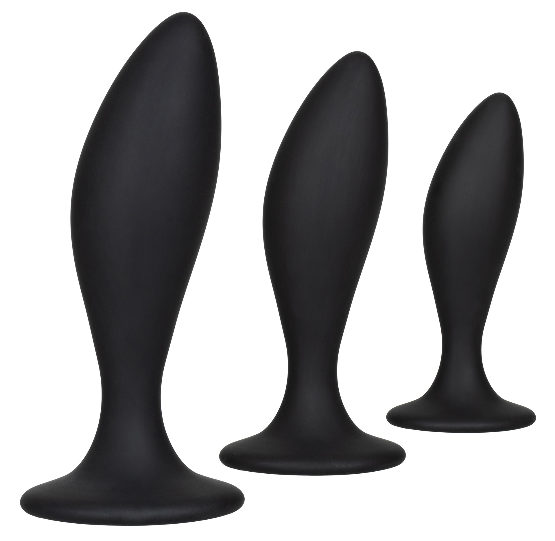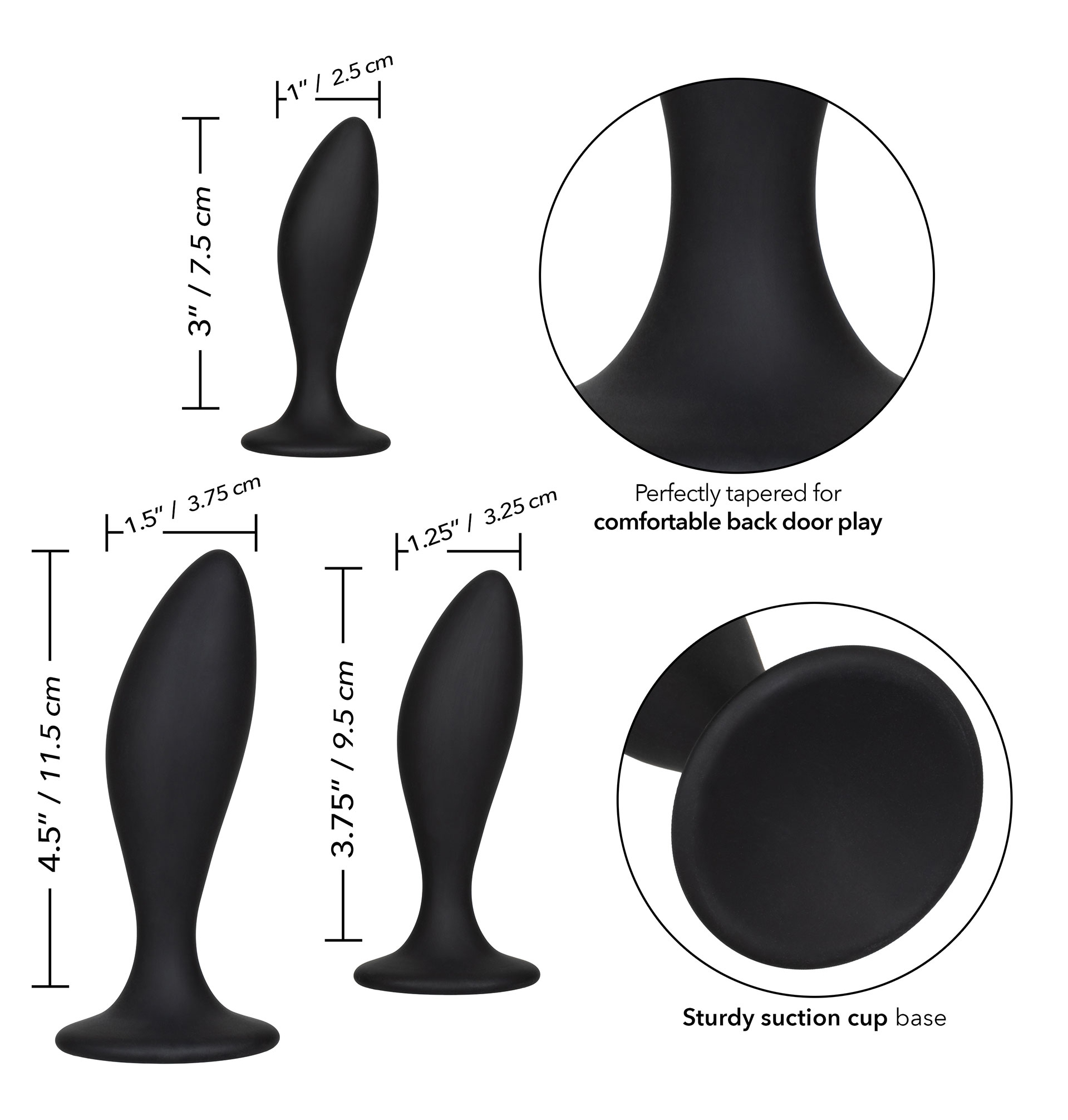 Voilà 3 plugs en silicone idéal pour obtenir des sensations plaisantes lors des premiers essais de plaisir anal. Dimensions des 3 tailles : Taille S : 7.5 x 2.5cm Taille M : 9.5 x 3.25cm Taille L : 11.5 x 3.75cm. Avec une base ventouse et une surface lisse.