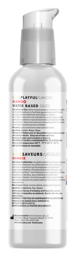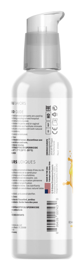 Lubrifiant à base d’eau, saveur mangue.Compatible préservatifs et sextoys.Flacon de 118 ml.