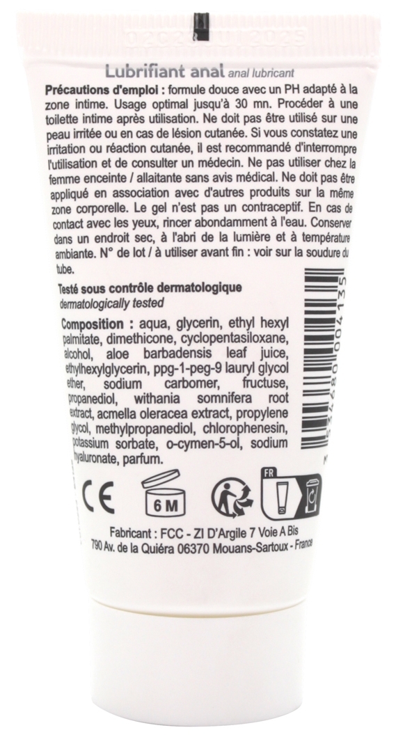Ingrédients : Aqua, Glycerin, Ethyl Hexyl Palmitate, Dimethicone, Cyclopentasiloxane, Alcohol, Aloe Barbadensis Leaf Juice, Ethylhexylglycerin, PPG-1-PEG-9 Lauryl Glycol Ether, Sodium Carbomer, Fructuse, Propanediol, Withania Somniferia Root Extract, Acmella Oleracea Extract, Propylene Glycol, Methylpropanediol, Chlorophenesin, Potassium Sorbate, O-cymen-5-ol, Sodium Hyaluronate, Parfum Précautions d’utilisation: Conserver dans un endroit sec et à l’abri de la lumière Garder hors de portée des enfants Éviter le contact avec les yeux, la peau abimée et les plaies. En cas d’irritations, arrêter l’usage et de consulter un médecin si cela persiste Tester sur une petite surface. En cas de rougeurs, allergies ou gênes, ne pas utiliser Ce lubrifiant n’est pas un contraceptif. Il ne contient pas de spermicide Ne pas avaler