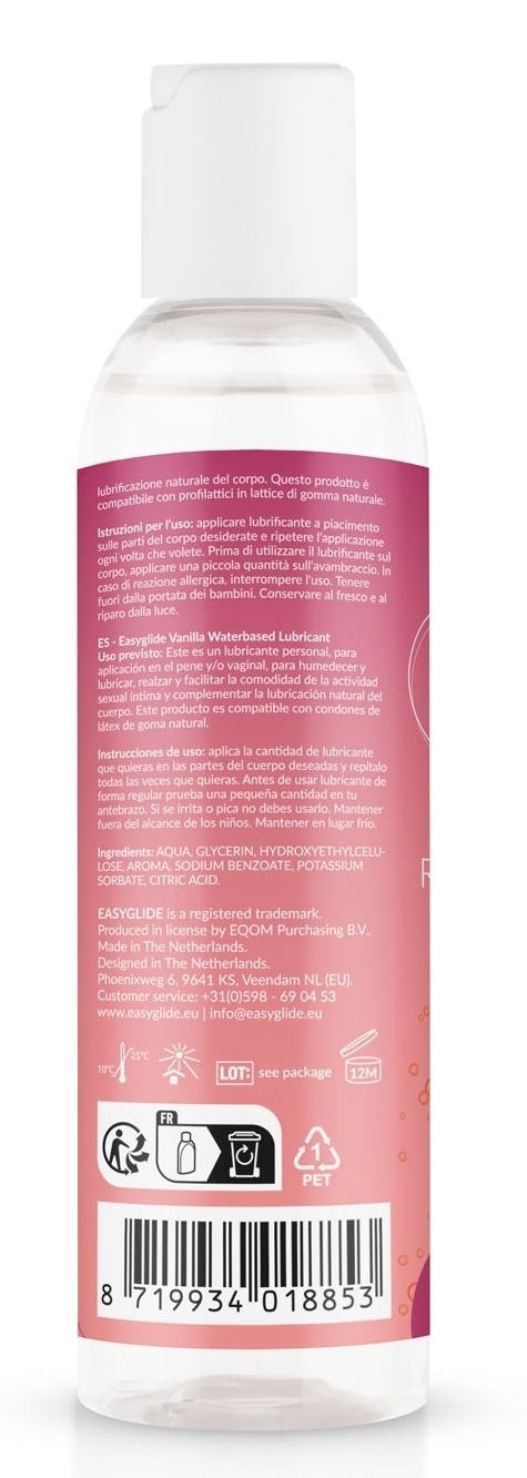 Précautions d’utilisation : Conserver dans un endroit sec et à l’abri de la lumière Garder hors de portée des enfants Éviter le contact avec les yeux, la peau abimée et les plaies. En cas d’irritations, arrêter l’usage et de consulter un médecin si cela persiste Tester sur une petite surface. En cas de rougeurs, allergies ou gênes, ne pas utiliser Ce lubrifiant n’est pas un contraceptif. Il ne contient pas de spermicide Ne pas avaler Composition : Aqua, glycerin, PEG-40 Hydrogenated Castor Oil, Aroma, Carrageenan, Propylene Glycol, Sodium Benzoate, Potassium Sorbate, Citric Acid, Sucralose.