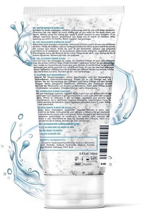 Composition: Aqua, Glycerin, Hydroxyethylcellulose, Sodium Benzoate, Potassium Sorbate, Sodium Hydroxide, Sodium Acetate, Isopropyl Alcohol, Cellulose, Citric Acid Précautions d’utilisation: Conserver dans un endroit sec et à l’abri de la lumière Garder hors de portée des enfants Éviter le contact avec les yeux, la peau abimée et les plaies. En cas d’irritations, arrêter l’usage et de consulter un médecin si cela persiste Tester sur une petite surface. En cas de rougeurs, allergies ou gênes, ne pas utiliser Ce lubrifiant n’est pas un contraceptif. Il ne contient pas de spermicide Ne pas avaler