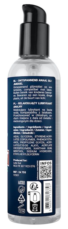 Composition : Aqua, Glycerin, Styrene/Acrylates Copolymer, Phenoxyethanol, Propylene glycol, Acrylates/C10-30 Alkyl Acrylate Crosspolymer, Xanthan Gum, Menthol, Sodium Hydroxide, Ethylhexylglycerin.Précautions d’utilisation :Conserver dans un endroit sec et à l’abri de la lumièreConserver 12 Mois maximum après ouvertureGarder hors de portée des enfantsÉviter le contact avec les yeux, la peau abimée et les plaies.En cas d’irritations, arrêter l’usage et consulter un médecin si cela persisteTester sur une petite surface. En cas de rougeurs, allergies ou gênes, ne pas utiliserCe lubrifiant n’est pas un contraceptif. Il ne contient pas de spermicideNe pas avaler