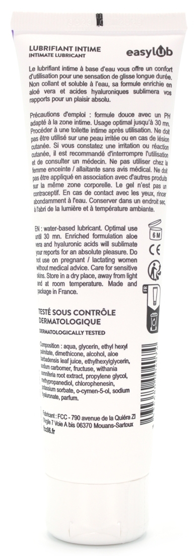 Le lubrifiant intime Easylub est composé d’une formule à base d’eau. La texture est souple, non grasse et non collante.Il améliore la lubrification et rend le rapport sexuel plus confortable. Il est enrichi en Aloe Vera et Hyaluronic. Compatible avec les préservatifs en latex