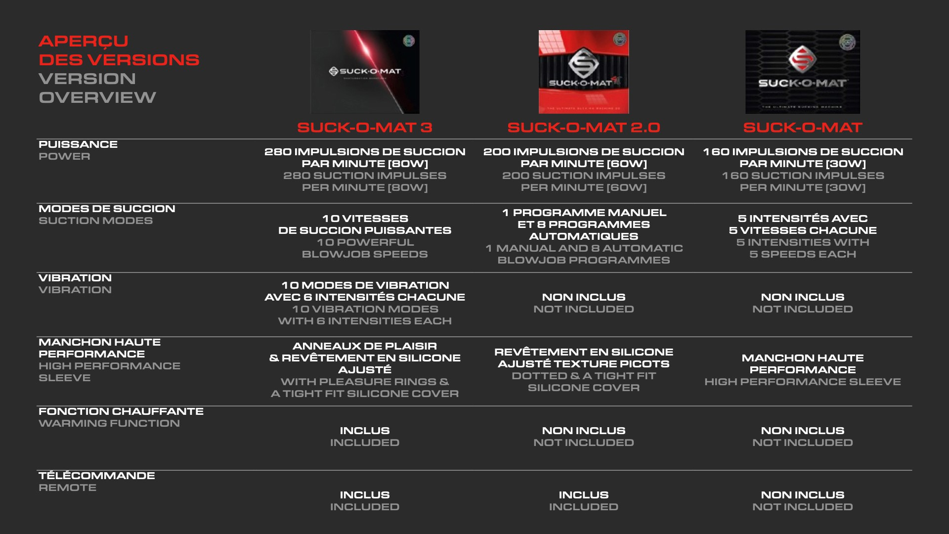 Caractéristiques : 10 modes de succion 10 modes de vibrations Moteur avec puissance de 280 coups/min Branchement Secteur Longueur insérable dans le tube 15.5 cm. Diamètre de 2.5 cm Dimensions de la centrale de contrôle 30.5 x 19 x 13 cm Longueur du câble 18 cm Matières ABS, silicone, polyuréthane
