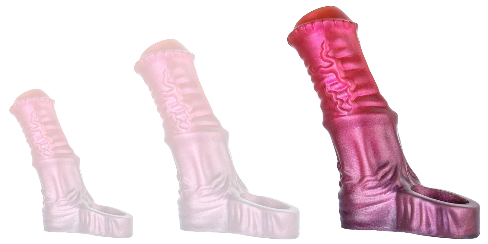 Longueur de 13 cm et largeur extérieure de 4.5 cm.Diamètre intérieur de 25 mm, extensible grâce à la matière silicone.Surface veinée.Anneau pour le maintien au-dessus des bourses.