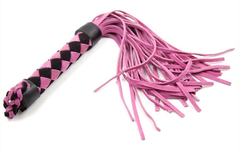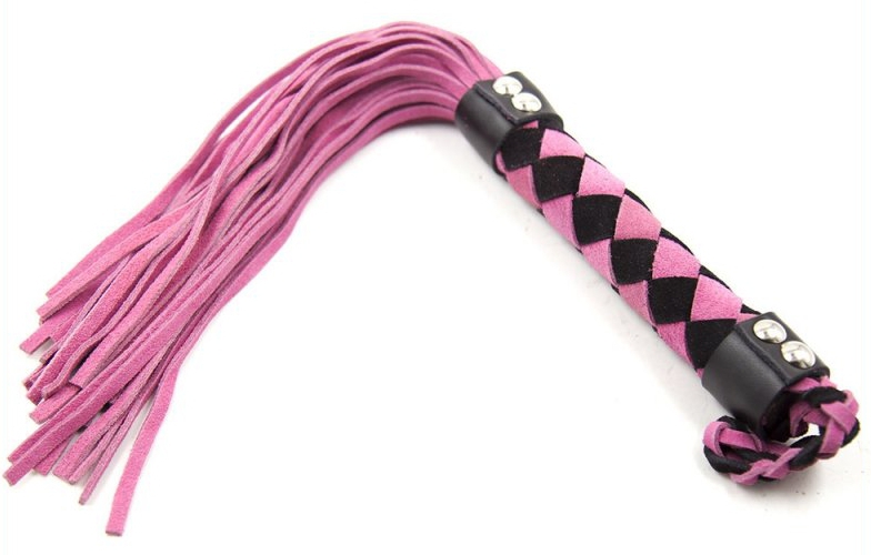 Le martinet Joker est réalisé avec des lanières souples de 23cm. Elles ont un aspect cuir sans peau et apportent de la douceur.Le manche a un décor en damier noir et rose. La longueur totale est de 40cm. Il est fabriqué en simili (matière polaire épaisse)