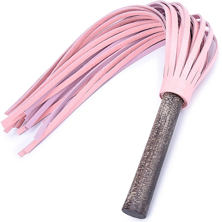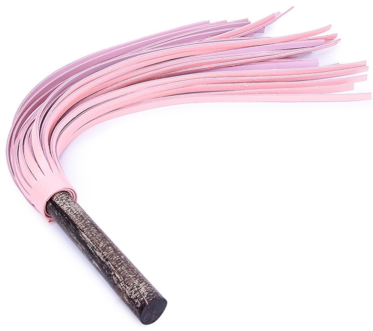Martinet à lanières rose pâle. Manche en bois, effet brut, de 14 cm de long sur 3 cm de large.  Lanières de 38 cm en cuir.