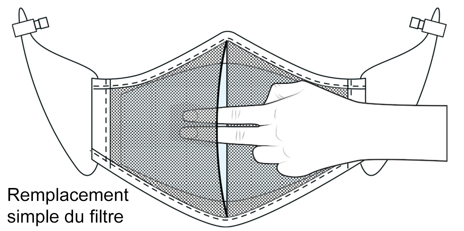 Les filtres sont conçus avec 6 couches Polypropylène superposées et combinées donnant différentes densités de filtration. Mode d’emploi: Comment le mettre en place? Se laver les mains (eau ou solution hydroalcoolique) Prendre le masque et le filtre Placer le filtre à l’intérieur du masque Positionner le masque sur votre visage en ajustant au plus près de la peau et en s’assurant que le nez et la bouche sont bien couverts Il est prêt à être utilisé Comment retirer le masque ? Préparer une bassine d’eau pour recevoir le masque Se laver les mains (eau ou solution hydroalcoolique) Enlever avec précaution le masque Retirer le filtre et le mettre dans la bassine Mettre le masque dans la bassine Passer au nettoyage Comment laver mon masque et le filtre? Se laver les mains (eau ou solution hydroalcoolique) Mettre le filtre dans de l’eau bouillante pendant 3 minutes (réutilisation du filtre 10 fois maximum) Le masque peut se laver à la main ou en machine (60°C minimum) ATTENTION: Dans tous les cas, se laver les mains (eau ou solution hydroalcoolique) si elles sont en contact avec l’extérieur du masque potentiellement contaminé Composition: Extérieur: 65% Polyester 35%CotonIntérieur: 100% polyuréthaneElastiques: 100% Polyester