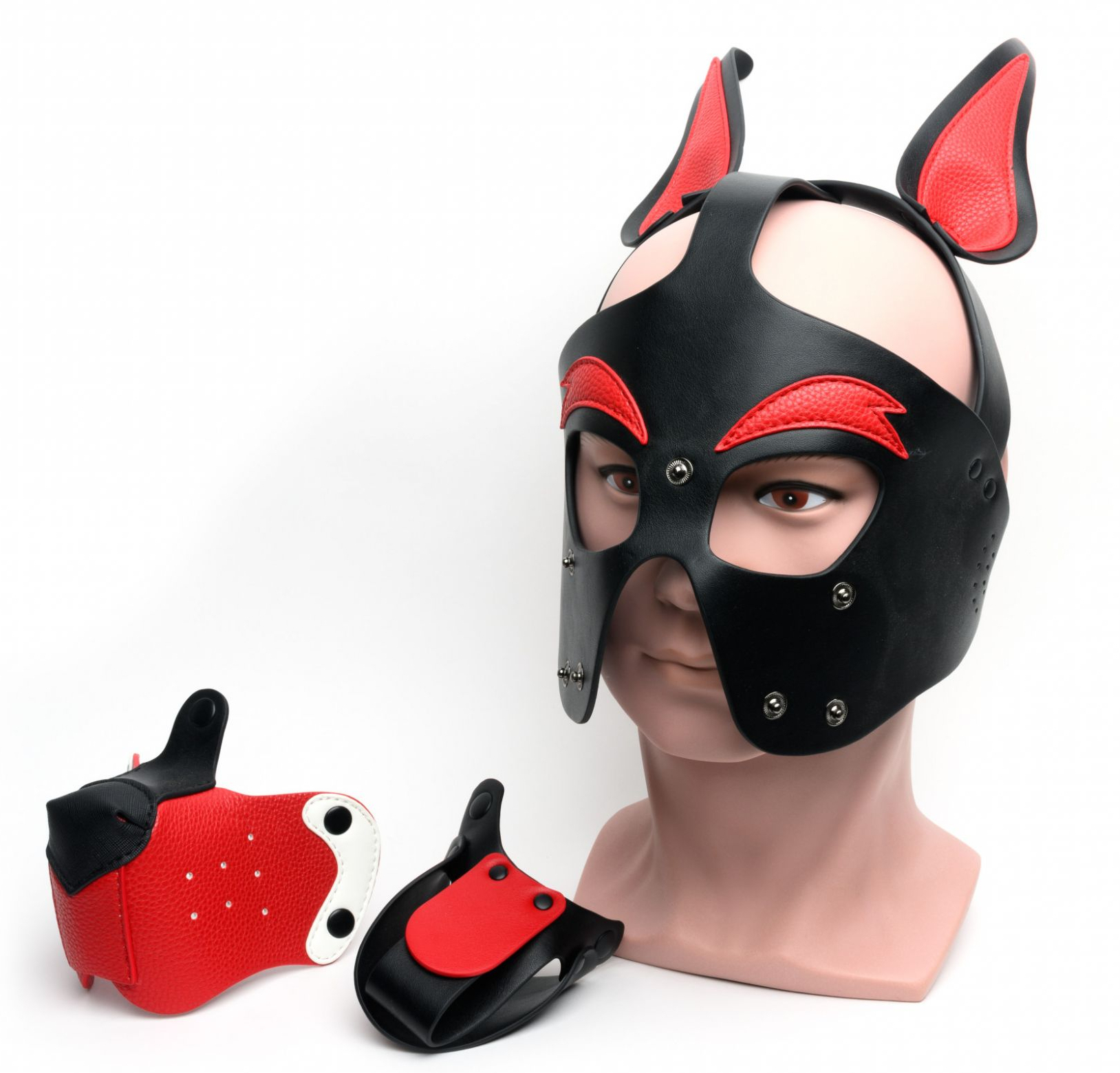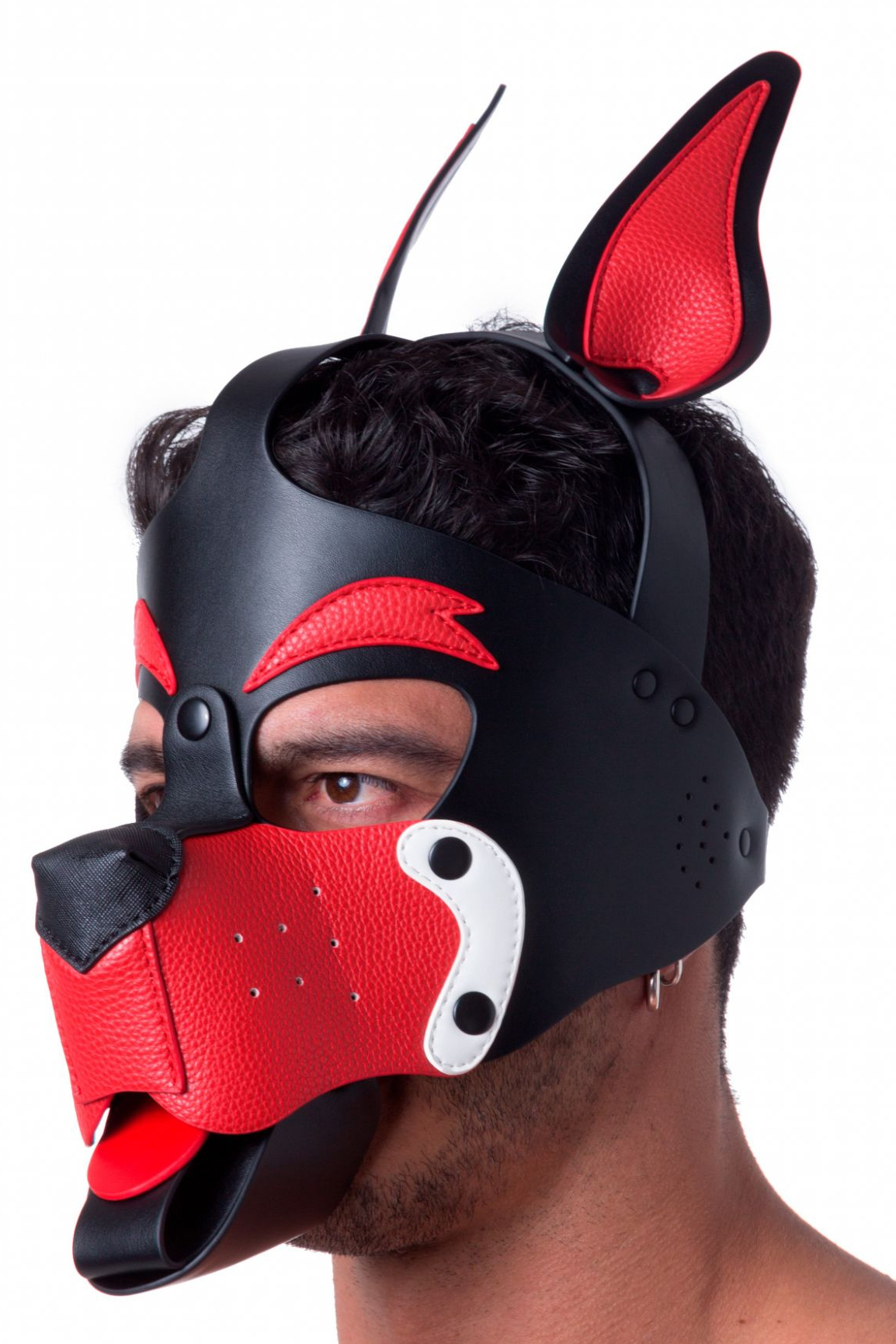 Le Masque PUPPY 665 Rouge et Blanc se présente ici dans sa version à dominante rouge hormis les côtés du museau blanc.  Profitez de séances de puppy play incroyables en arborant ce masque à vos couleurs.  Sa flexibilité vous permettra un port agréable.  Il a été conçu avec :  des oreilles droites un museau et une langue amovibles une sangle En polyuréthane