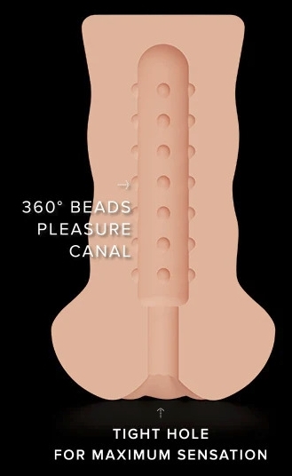 Masturbateur avec entrée anus d’une longueur insérable de 12 cm. Intérieur texturé. En matière RST© (Real Skin Touch), mélange TPE/silicone.