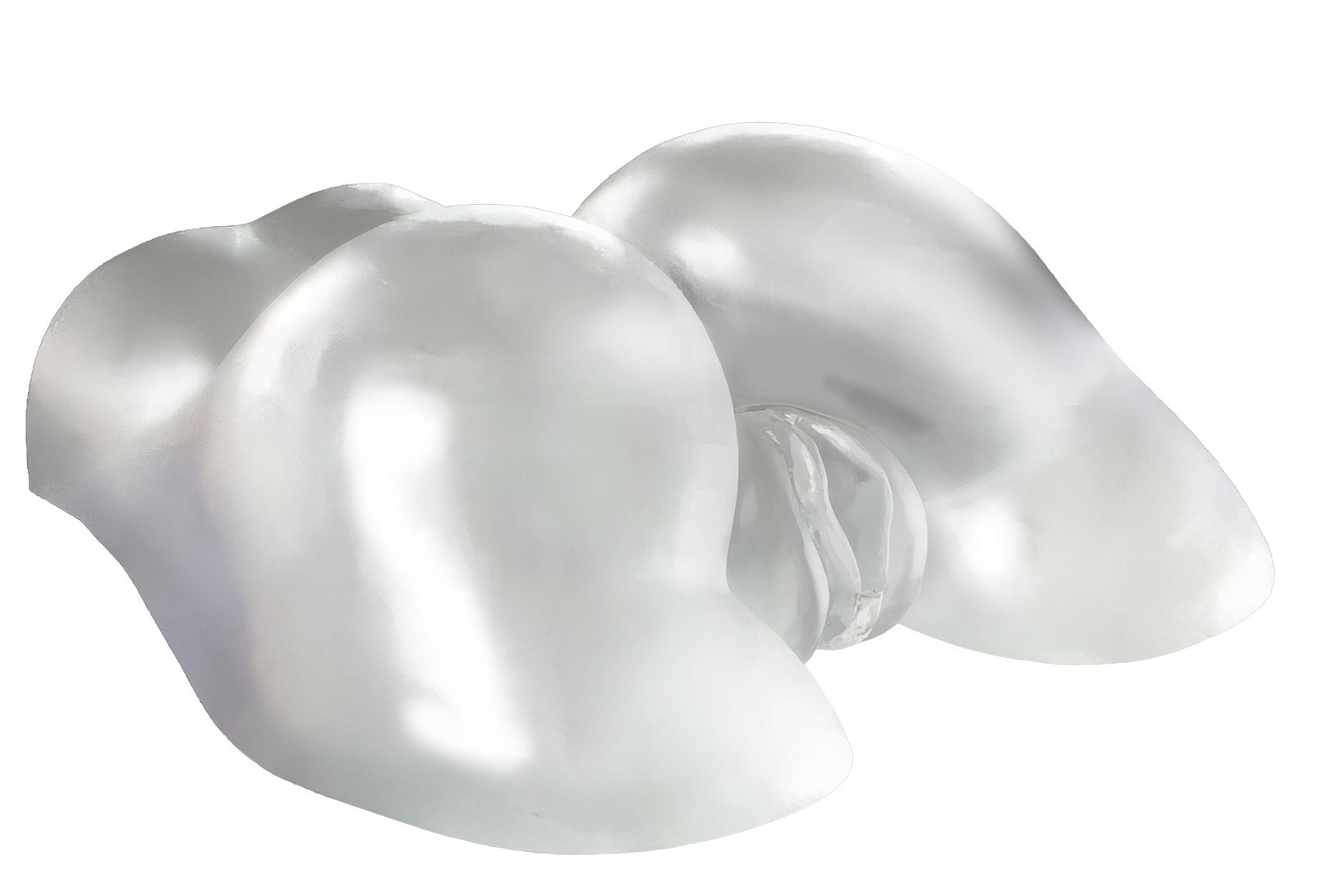 Masturbateur transparent de fessier féminin, transparent.  Une entrée vulve, avec surface interne texturée.  Longueur insérable de 15 cm.  En TPE.