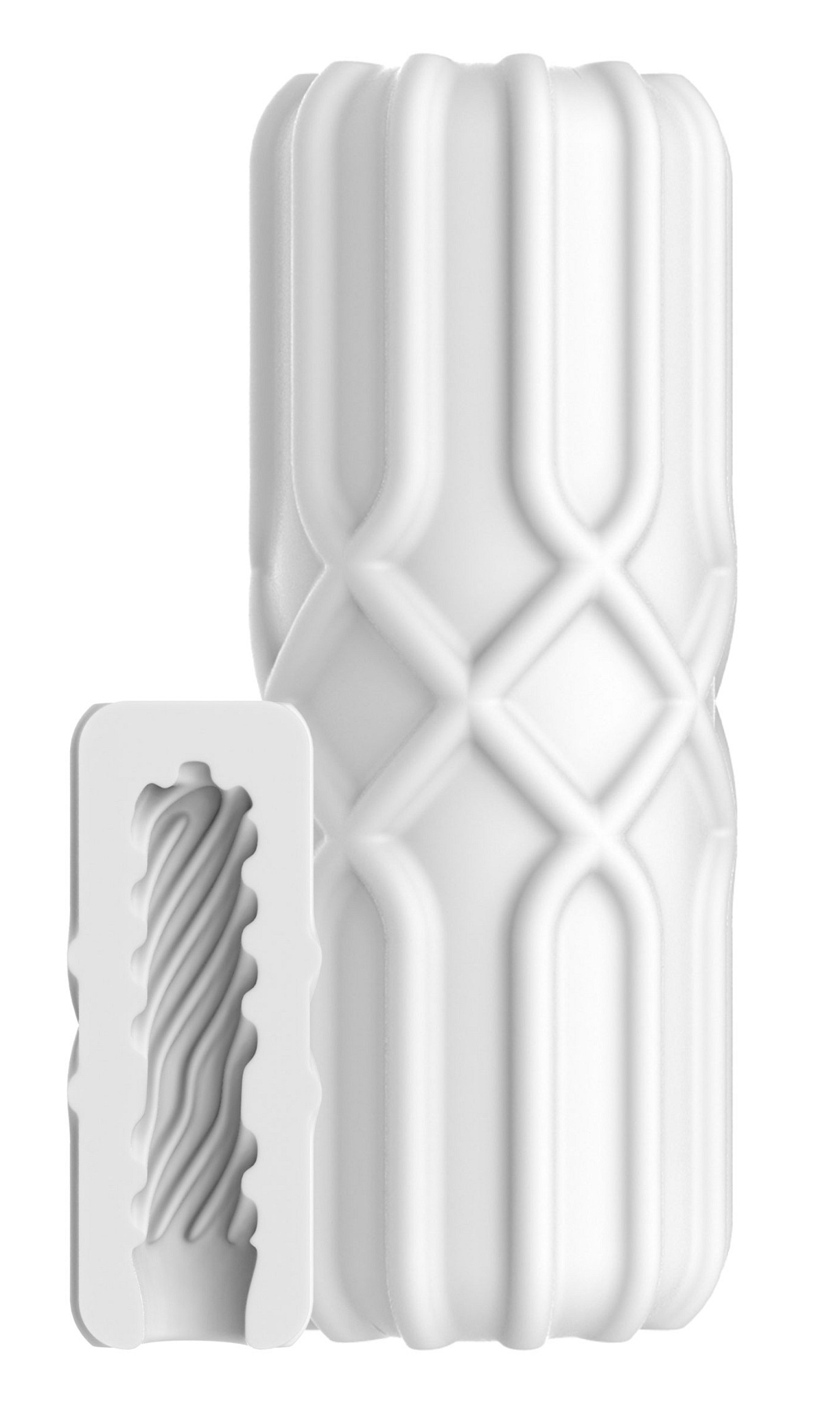 Masturbateur souple, sans coque, avec un intérieur texturé spécifique D’une longueur d’insertion de 13 cm et largeur de 2.5 cm En TPE très extensible blanc
