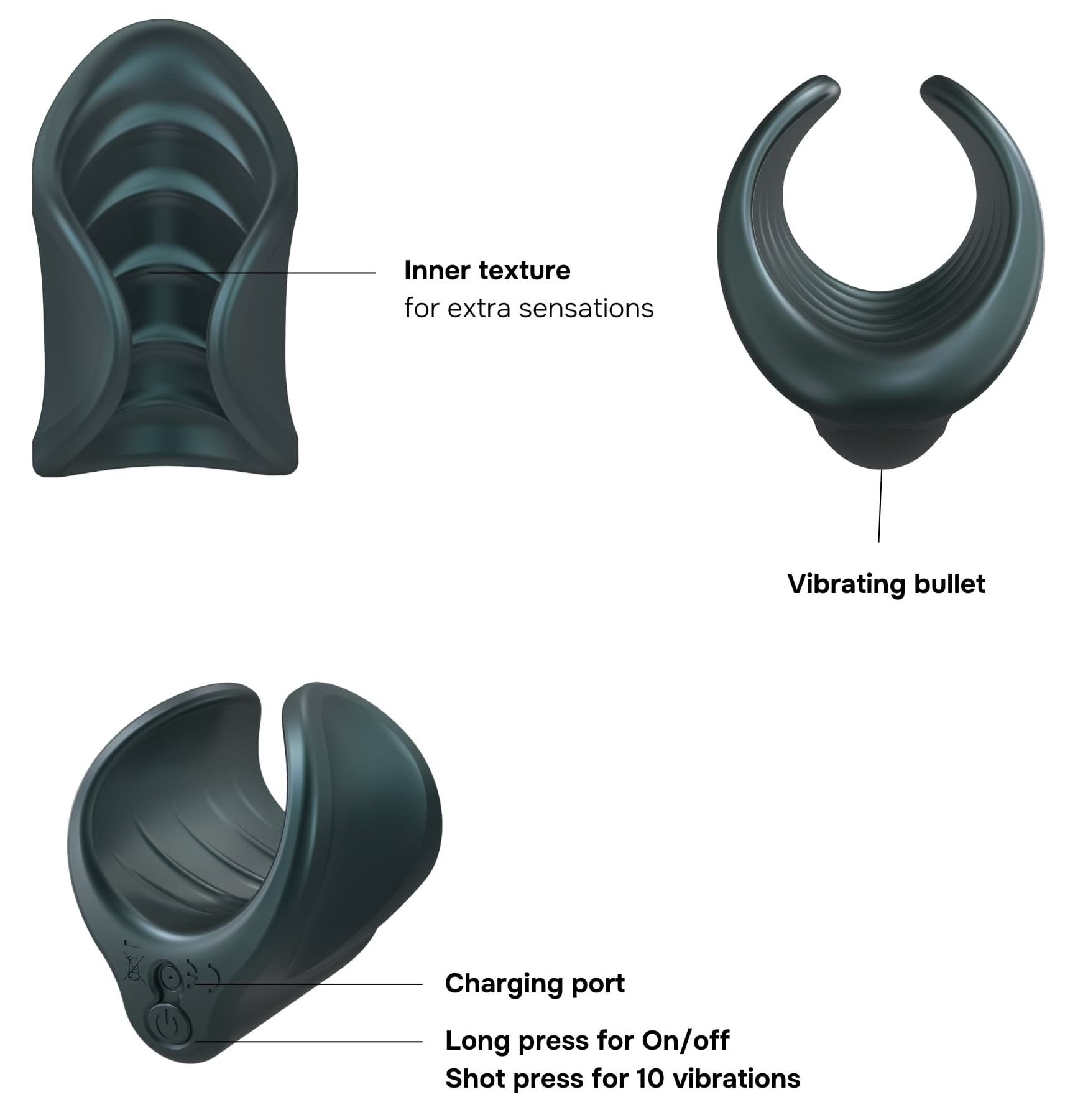 Masturbateur avec 10 modes de vibrations.Diamètre intérieur de 35 mm avec les parties latérales souples.Longueur de 7.5 cm. En silicone.Recharge USB