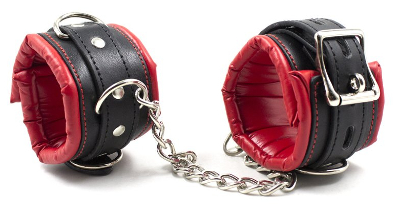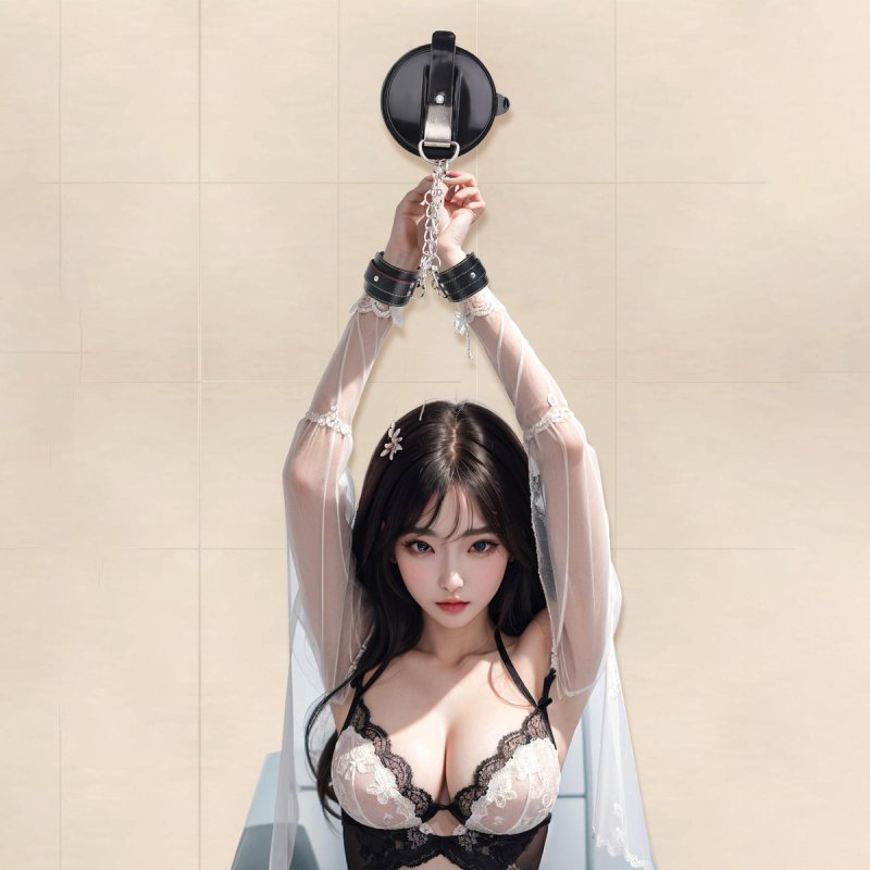 Menottes de poignets, ajustables de 22 à 32 cm, larges de 6 cm.Ventouse d’un diamètre de 12 cm.En simili.