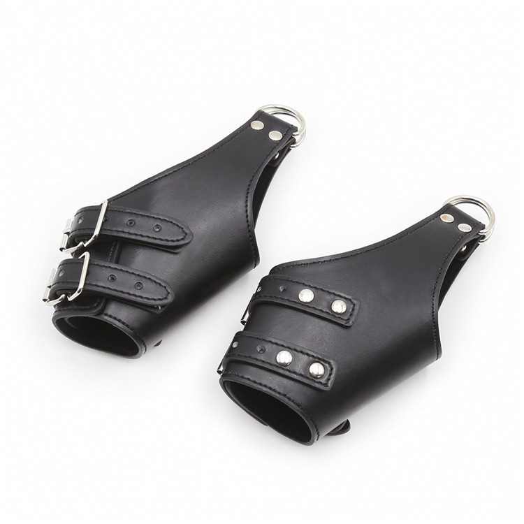 Ces menottes de poignets sont conçus pour les suspendre et bloquer les mouvements du partenaire.Elles sont réalisées en simili cuir (polyuréthane) avec deux rangées d’attaches aux boucles métalliques. Les anneaux supérieurs permettent la suspension
