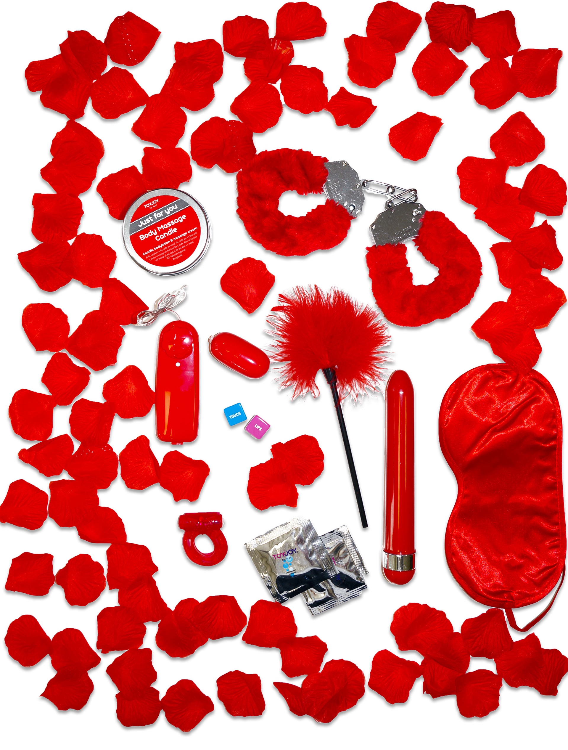 Ce pack Real Romance est proposé par la marque ToyJoy. Il est idéal pour passer une soirée érotique et agréable à deux.Les 8 sextoys sont de couleur rouge. Il est composé de : le vibro de 15 x 2.5cm l’oeuf vibrant de 5.5 x 2.5cm un plumeau des menottes avec fourrure un anneau vibrant un masque une bougie pour un massage sensuel des dés coquins. Complété par des fausses pétales rouges