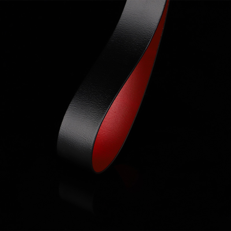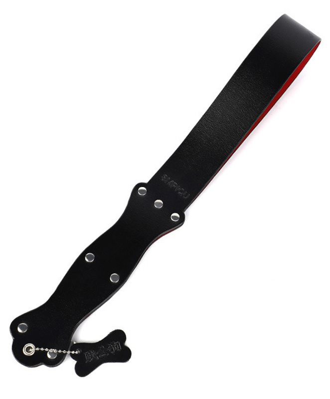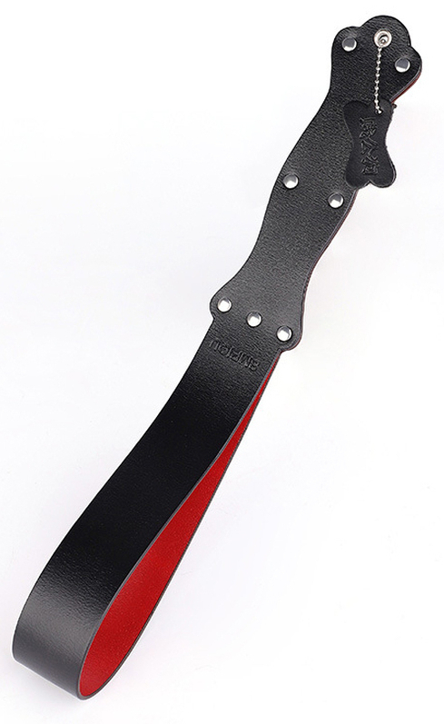 Paddle avec une bande souple de 22 cm de long pour 4 cm de large. Manche de 18 cm se terminant avec un petit os souple. En simili noir et rouge.