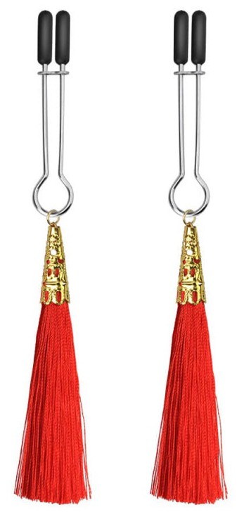 Avec ces 2 pinces à tétons vous allez pouvoir stimuler à la perfection cette zone très érogène du corps.Sa forme originale offre une mise en place facile et simple que vous pourrez ajuster à chacun grâce à sa barre coulissante vous permettant également de serrer plus ou moins les pinces.Composés de 2 pompons à franges rouges, ces accessoires vous aideront à pimenter vos soirées.
