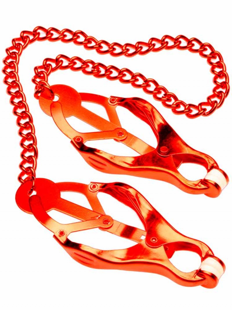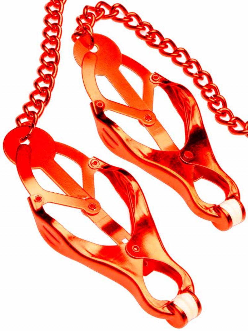 Ces pinces pour tétons sont proposées par la marque Mr fist. Il s’agit d’accessoire de plaisir permettant de stimuler les tétons et d’augmenter les jeux sexuels.Chacune des pinces mesure 9cm de longueur. La chaîne mesure 32cm.Elles sont fabriquées en aluminium